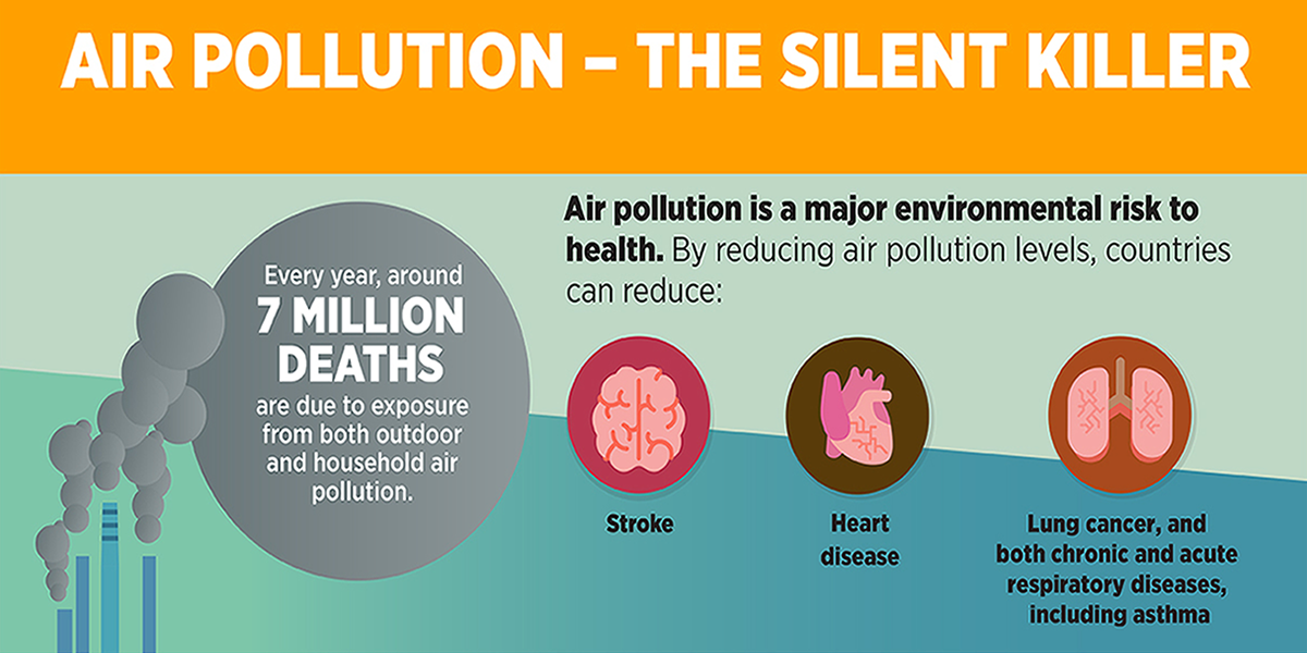 WHO estimates that around 7 million people die every year from exposure to fine particles in polluted air that penetrate deep into the lungs and cardiovascular system, causing diseases including stroke, heart disease, lung cancer, chronic obstructive pulmonary diseases and respiratory infections, including pneumonia.