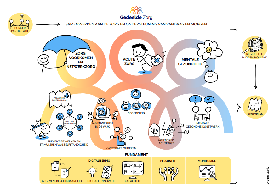 De bevolking in de regio neemt flink toe, vergrijst sterk en er is een groter tekort aan zorgpersoneel dan gemiddeld in Nederland. De toegekende € 50 miljoen wordt de komende tweeënhalf jaar geïnvesteerd in het toegankelijk houden van de zorg, het verlagen van de druk op professionals en het geven van meer regie aan inwoners over hun eigen gezondheid. Het resultaat is straks op diverse plekken te merken: minder ligdagen in het ziekenhuis, kortere wachttijden voor de ggz en ouderen wonen langer zelfstandig thuis. Bijna alle zorg- en welzijnsaanbieders en de vijf gemeenten in de regio hebben in samenwerkings-organisatie Gedeelde Zorg meegewerkt aan de ontwikkeling van het plan. Voorzitter Jeroen van den Oever: “Heel Nederland heeft te maken met vergrijzing en personeelstekort. In Midden-Holland is de uitdaging nog groter. De bevolking groeit tot 2040 met 25%, waar dat landelijk gemiddeld 8% is. Bovendien bewegen inwoners van Midden-Holland minder en ervaren zij meer stress. De druk op zorg neemt daarmee extra toe. Regionale uitdagingen kun je alleen regionaal oplossen. Dus hebben we de koppen bij elkaar gestoken voor een plan om de zorg goed, toegankelijk en betaalbaar te houden. We zijn natuurlijk heel blij dat we nu groen licht hebben en kunnen niet wachten om aan de slag te gaan.”