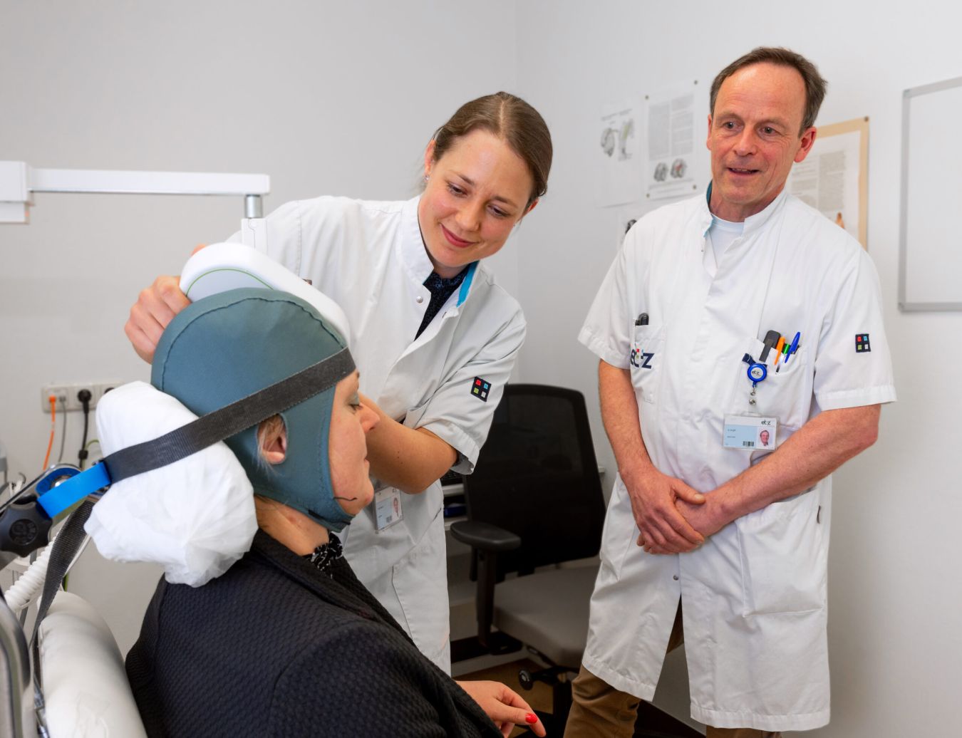 Samen met collega Dirk de Knijff voert psychiater Dieuwertje de Waardt een rTMS-behandeling uit.