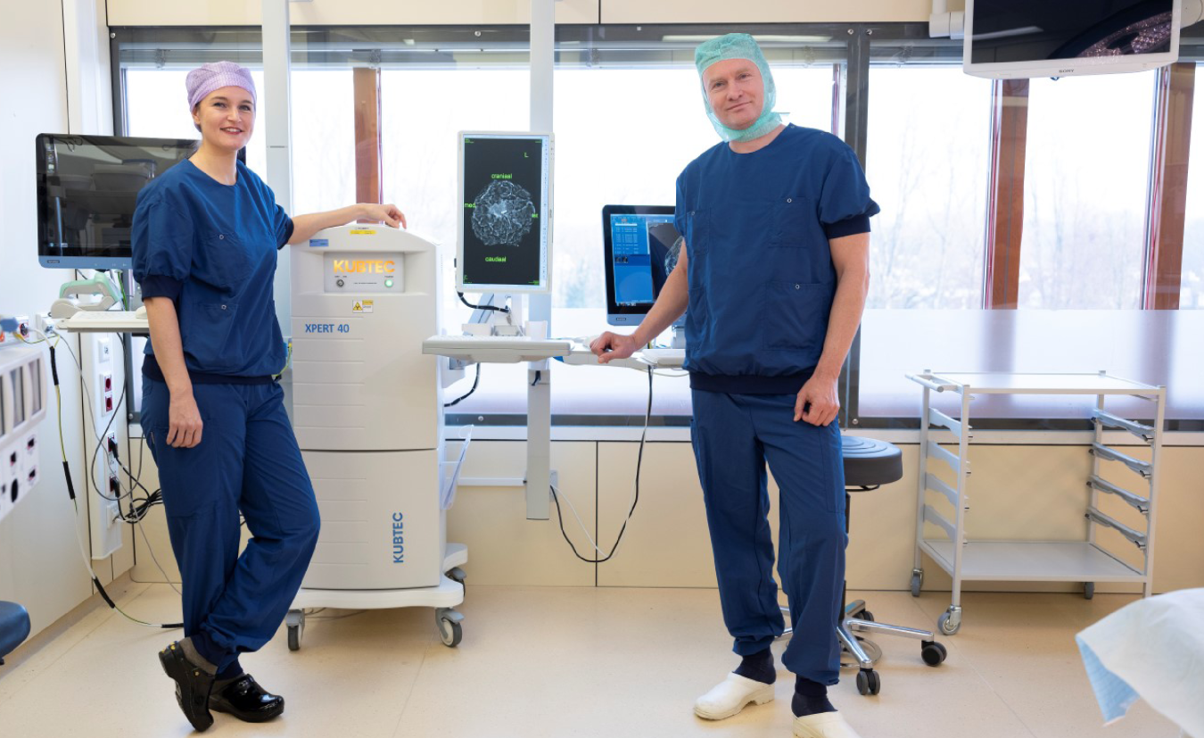 Bij een borstsparende operatie blijft de vorm van de borst behouden. Alleen het gebied met daarin de afwijking wordt met een marge uit de borst weggenomen. Door gebruik te maken van de KubTec bij een patiënt met borstkanker kun je een nog nauwkeurigere borstsparende operatie uitvoeren en indien nodig direct een extra marge borstweefsel weghalen. Door deze nieuwe techniek kan men sneller werken en wordt de kans op een tweede operatie veel kleiner.