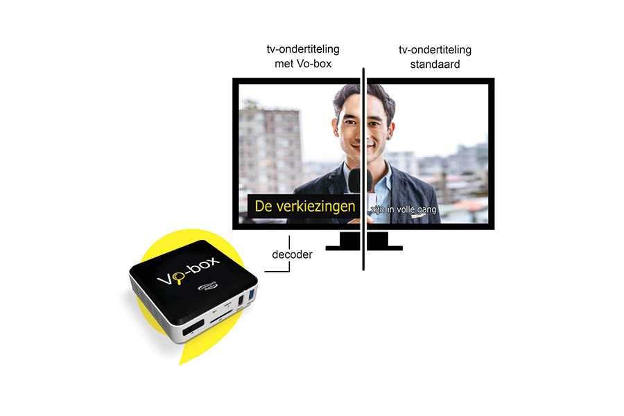 De VO-box kan de ondertiteling tot twee keer zo groot weergeven op het scherm. Bovendien kan de kijker het contrast zelf aanpassen door de kleur van de letters en/of de achtergrond te wijzigen. Daardoor zijn de ondertitels nog eenvoudiger te onderscheiden en sneller te lezen.