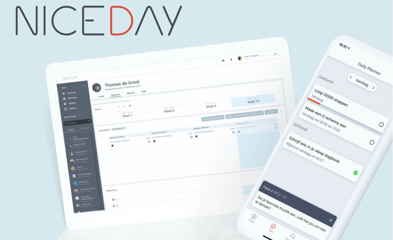 Naast videobellen biedt NiceDay voor zowel behandelaar als cliënt verschillende functionaliteiten en educatie aan. Zo kan de cliënt eenvoudig een dagboek en stappenteller bijhouden, een relevant artikel lezen, G-schema’s invullen of de stemming registreren. De behandelaar heeft via het NiceDay portaal direct toegang tot deze gegevens en kan de cliënt direct ondersteunen, mocht dit nodig zijn.