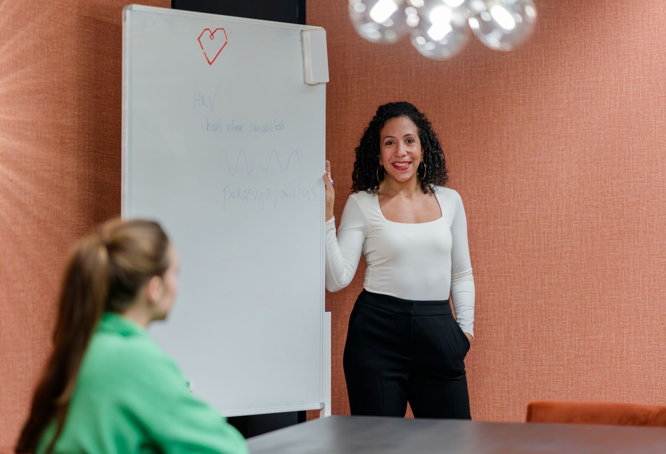 Fabienne: “Beter voelen doe je door beter contact te maken met je lichaam. Bij voelen denken mensen vaak aan gevoelens. Maar voelen gaat ook over lichamelijke sensaties. Een hogere hartslag, ademhaling, tintelingen. Die moeten mensen leren herkennen. Want dáár gaat het vaak fout. Mensen herkennen niet hoe hun lichaam reageert op stress, waardoor ze maar doorgaan. Totdat het te laat is. Door middel van realtime data krijgen deelnemers meer inzicht in wat er in het lichaam gebeurt en leren ze daar invloed op uit te oefenen. Dit wordt ook gebruikt tijdens de 1-op-1 sessies. En dat maakt onze aanpak echt uniek.”