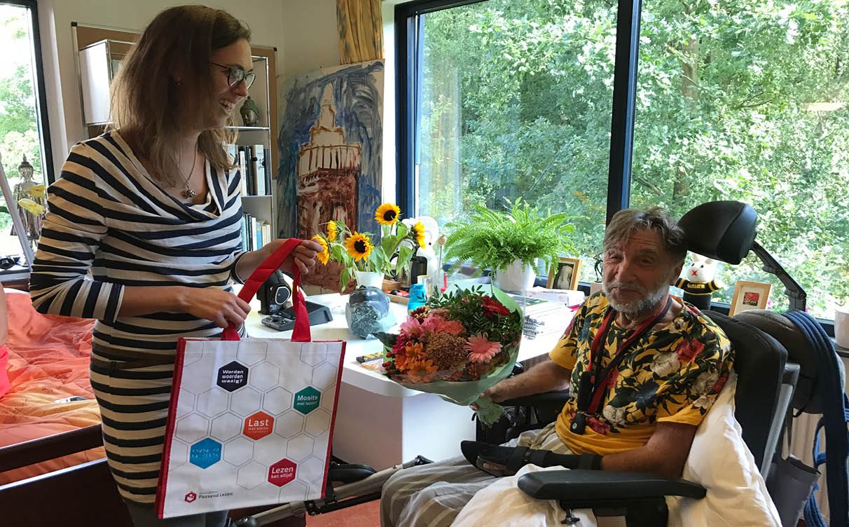 Meneer Peters was zeer blij en verrast met het bezoek. Zijn mantelzorger heeft hem ingeschreven bij Passend Lezen en hij heeft enorme zin om weer te lezen. Op de vraag wat het luisteren naar gesproken boeken voor hem betekent, antwoord hij: “Ik kan weer mijn eigen fantasie gebruiken. Dit wordt mijn wereld. Naar muziek luisteren is ook fijn, maar dat doe je ook niet de hele tijd.” Daarnaast ziet meneer Peters dit als een middel tegen de eenzaamheid. “Het haalt je ook zo uit het isolement. Zo heb je iemand die tegen je aan praat” voegt Peters er zichtbaar emotioneel aan toe.