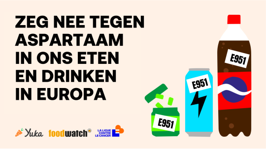 In juli 2023 verklaarde het Internationaal Agentschap voor Kankeronderzoek (IARC) van de Wereldgezondheidsorganisatie (WHO) de zoetstof aspartaam (E951) als “mogelijk kankerverwekkend voor de mens”. Meer dan een jaar later is deze gevaarlijke stof nog steeds op de Europese markt te vinden. Foodwatch, het Franse La Ligue Contre Le Cancer en consumenten-app Yuka vinden dit onacceptabel en lanceren een grote Europese petitie om een verbod op aspartaam in voedingsmiddelen en dranken af te dwingen.