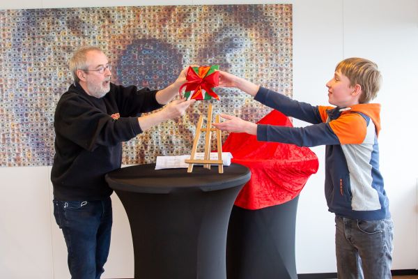 Ronald Giphart overhandigt debuut van zeer slechtziende Corné Hermans (12) uit Leiden