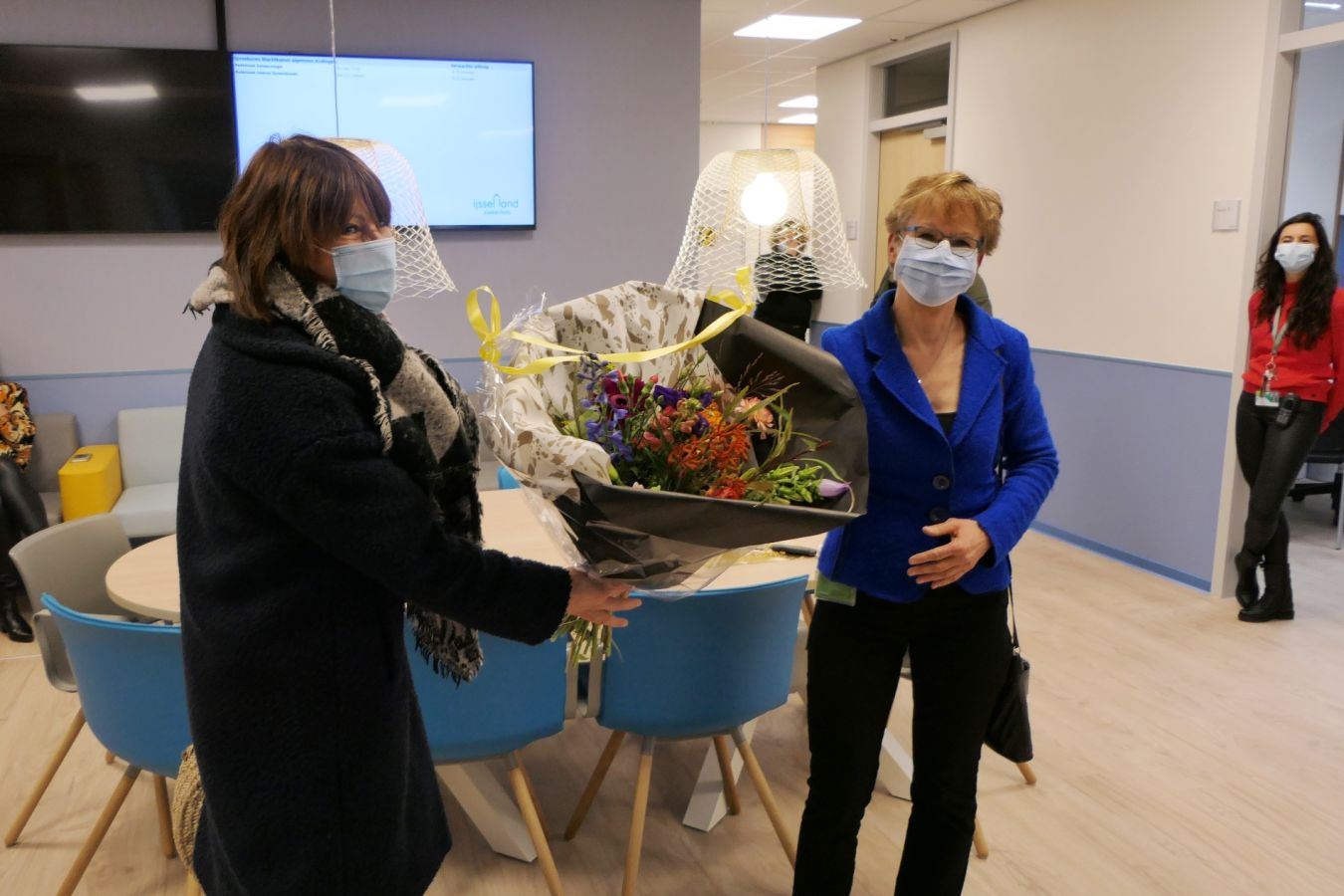 Ook de medewerkers kregen op hun nieuwe werkplek een warm welkom en een traktatie van Albert van Wijk en Hendrik Jan van de Berg, bestuurders van respectievelijk IJsselland Ziekenhuis en Lelie zorggroep.
