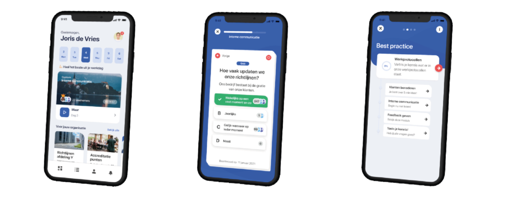 Christiaan legt uit: ‘Soms duurt een training vier uur. In die tijd zijn meerdere zorgmedewerkers dan niet inzetbaar. Als je daar een blended leertraject van maakt, is dat veel efficiënter. Dan hoeft die fysieke bijeenkomst maar één uur te duren. Door de overige kennis verspreid en in kleine, eenvoudige porties aan te bieden via de app, kunnen mensen in vijf minuten per dag informatie veel beter onthouden. Bovendien is leren op deze manier een stuk leuker.’