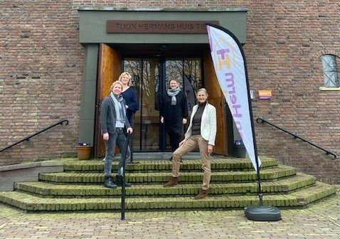 Fotobijschrift: Petra van Merkestein van Ziekenhuis Rivierenland, samen met Femke Riel, initiatiefneemster buddyhuis en Miriam Roeffen en Ellen Hoenderop van het Toon Hermans Huis Tiel.