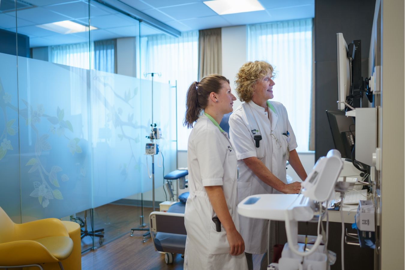 Chelsea Bödeker, verpleegkundig specialist in opleiding, en dokter Fransien de Boer, internist-hematoloog aan het werk in het Oncologisch Centrum van Ikazia.
