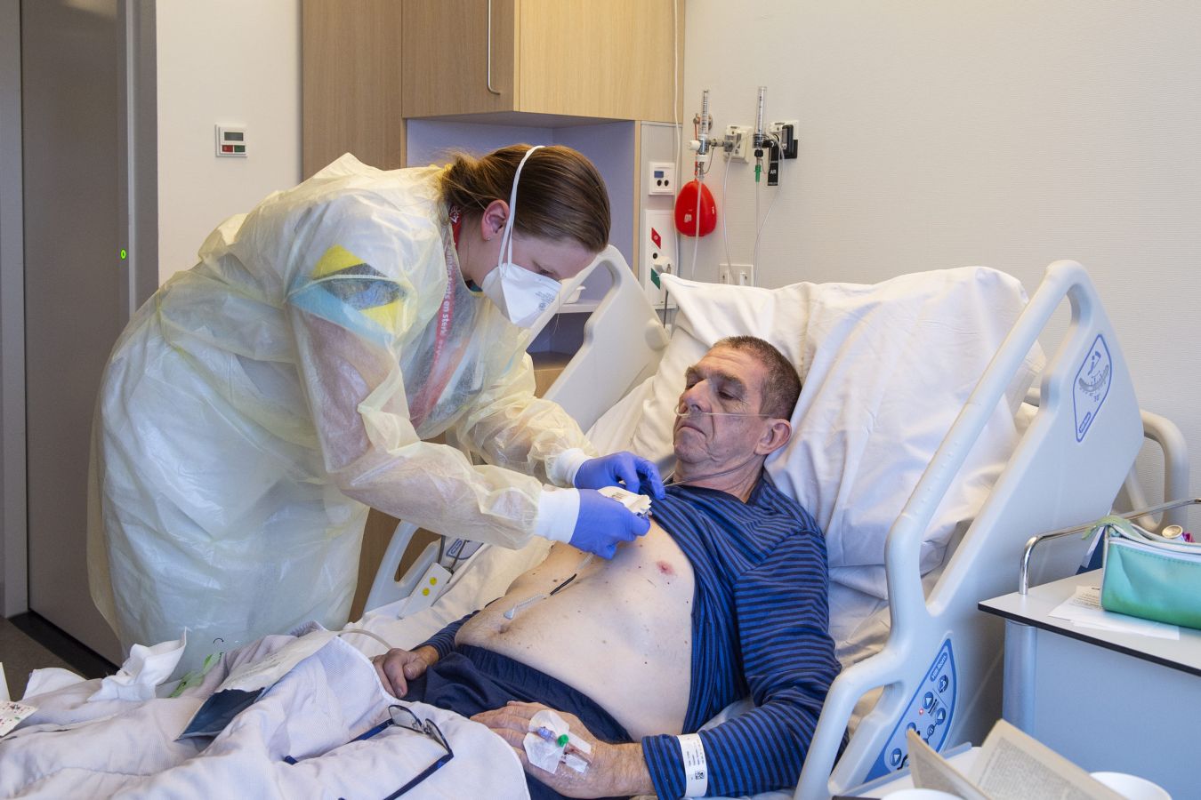 Patiënten die met corona op de verpleegafdeling liggen, krijgen sinds kort een slimme pleister met sensoren opgeplakt van de verpleegkundige. “Deze pleister meet continu de ademhalingsfrequentie, temperatuur en hartslag van de patiënt. Het is nuttig om continu te monitoren, want vooral deze drie waardes kondigen een verslechtering van de toestand van de patiënt aan. Eerder deden we deze metingen een paar keer per dag handmatig met apparatuur. En die zijn eigenlijk slechts een momentopname”, zegt Joost Morssinkhof, hoofd longgeneeskunde.